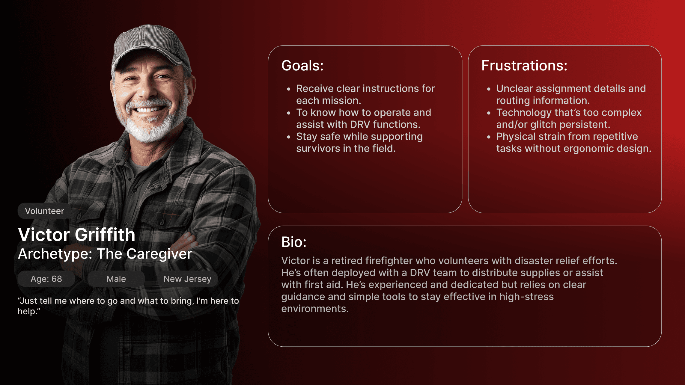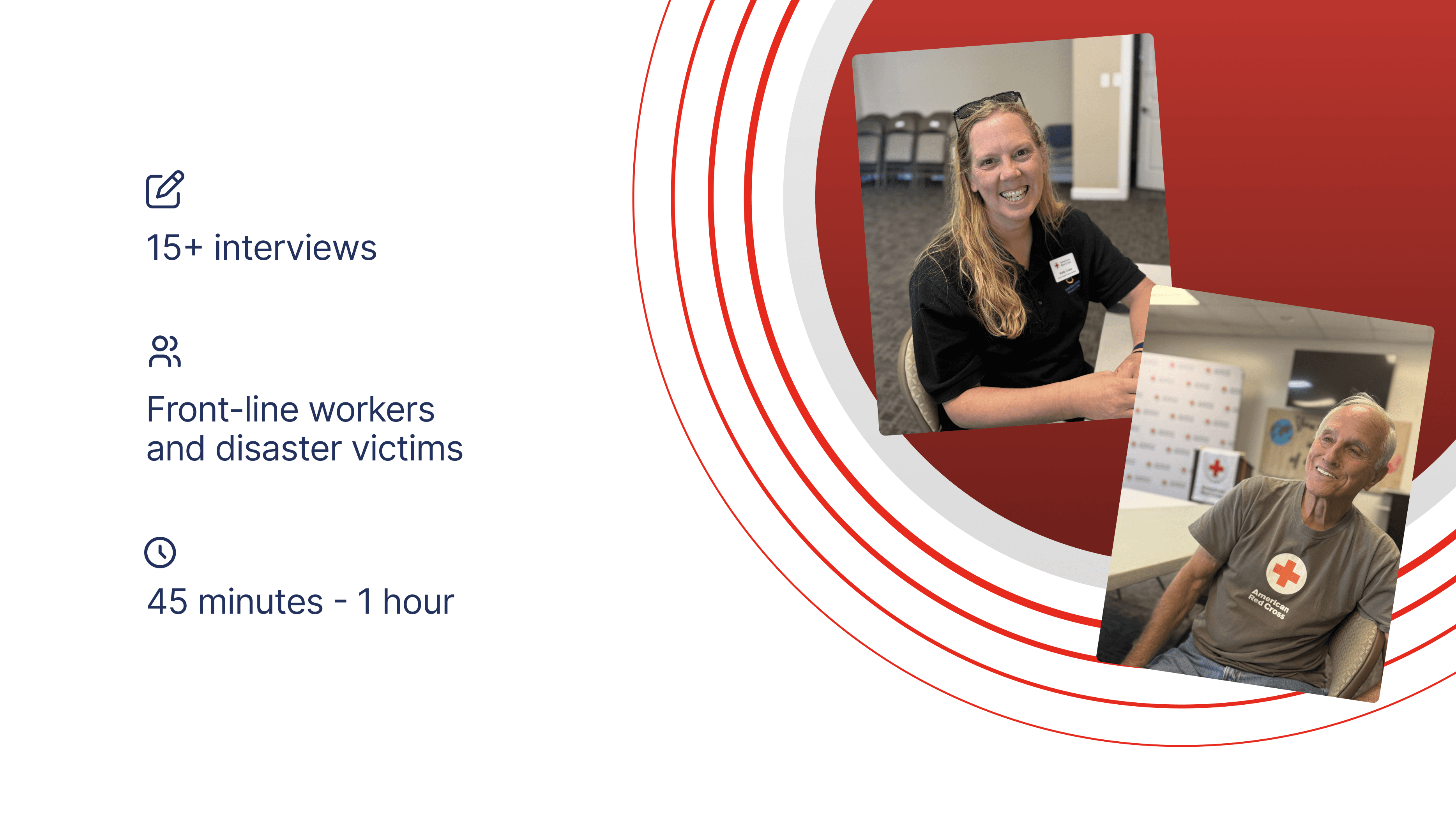 I spearheaded complex research findings from every phase of the design journey into clear, actionable strategies. I was able to distill the complexity of disaster response into four key opportunity areas: