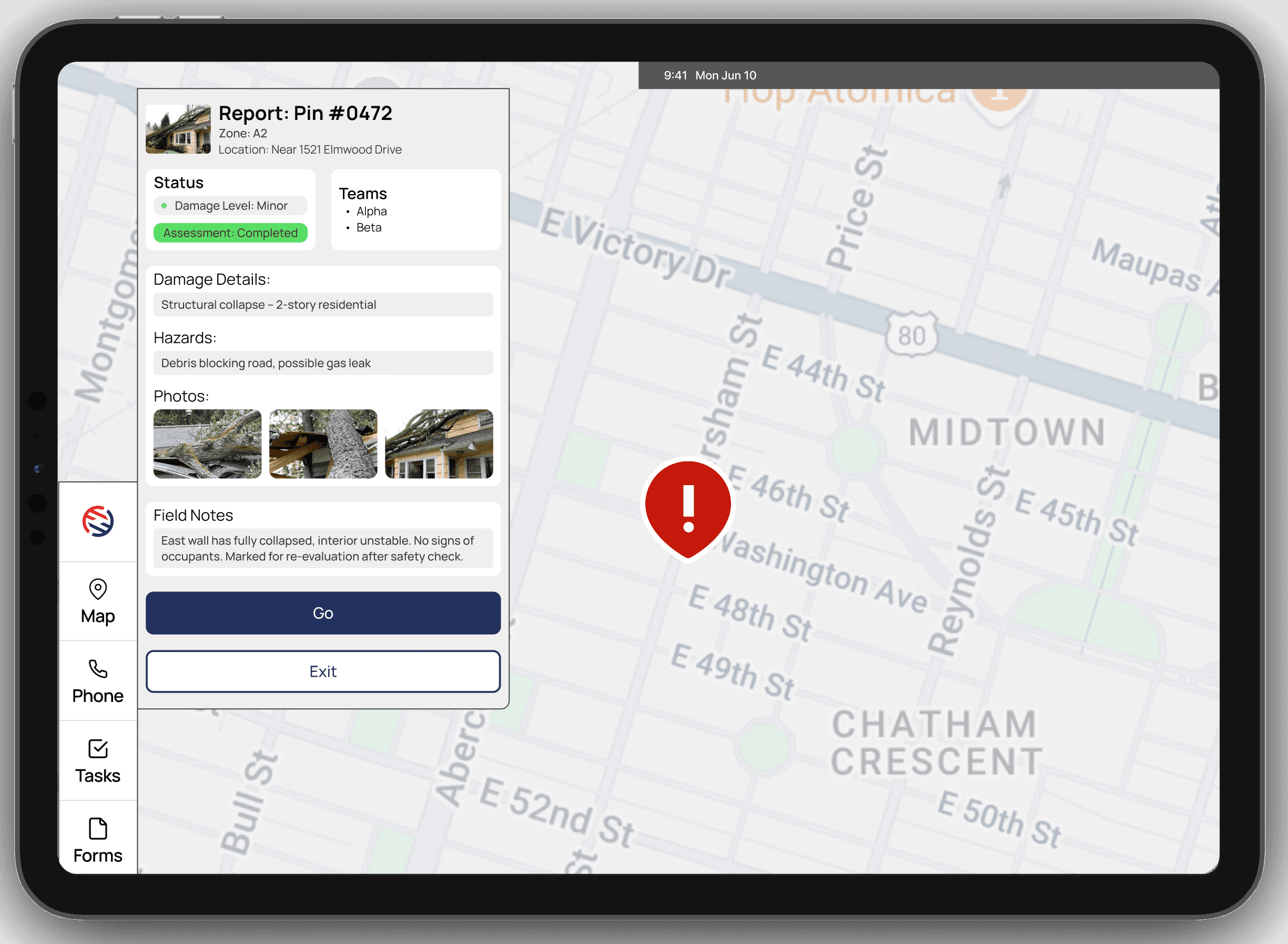 A digitized disaster reporting form with smart scene assessment tags, AI-assisted auto-fill reports, and team recommendations.